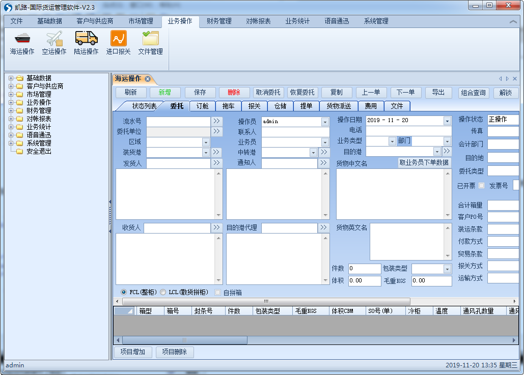 委托,訂艙,拖車,報關,倉儲,提單,貨物派送,應收,應付費用,相關文件上傳管理。 生成報關單,打印提單,可自定義提單格式,支持套打,多公司LOGO設置。應收應付費用單打印,自定義費用單,按不同幣種分配,利潤查詢統計。